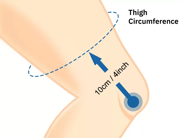 - 1. اثنِ ساقك بزاوية 30° وقيّس محيط الفخذ على بُعد 4’’ (10 سم) فوق صابونة الركبة.