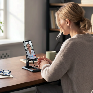 أستخدم الحامل لمكالمات الفيديو مع أصدقائي. يمكن وضعه في أي مكان، ويمسك هاتفي بقوة، ولا أحتاج للقلق من انزلاقه.