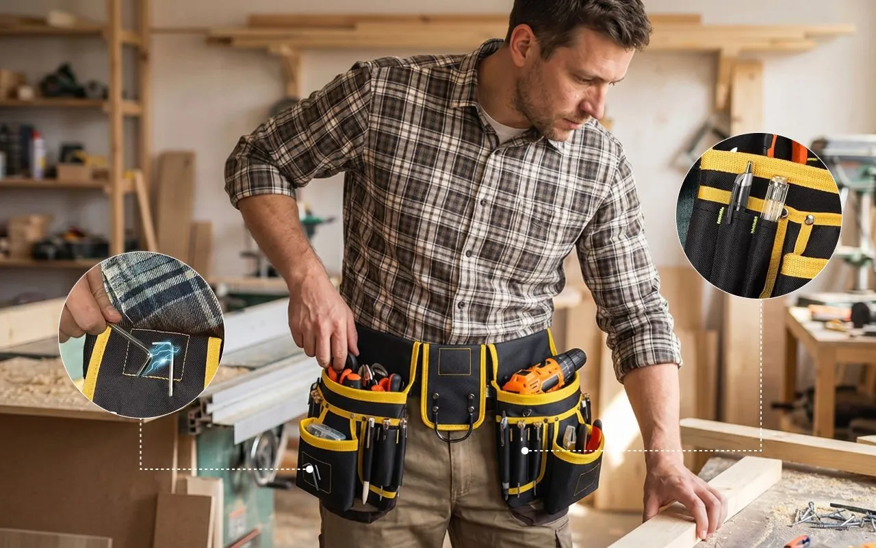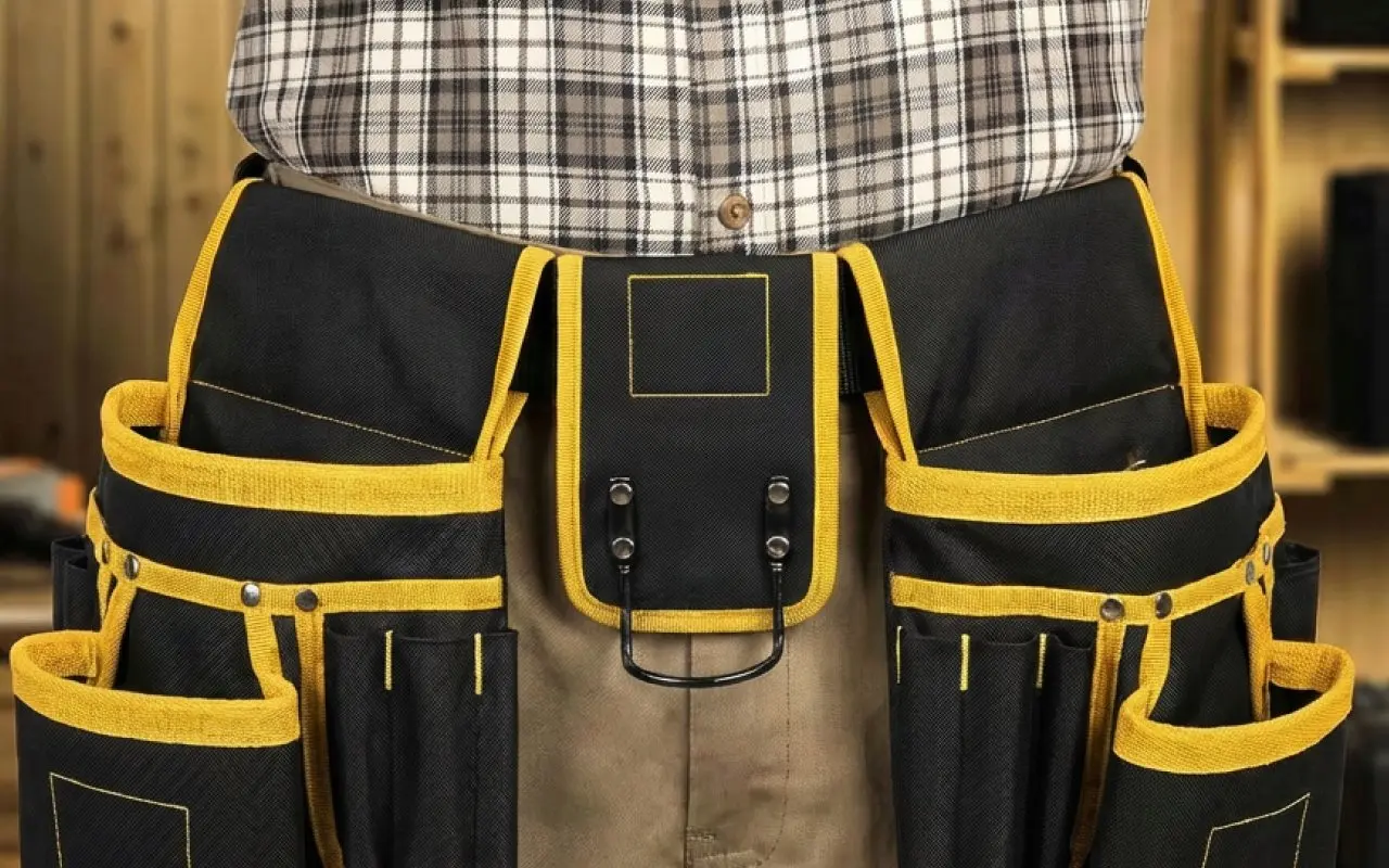 أستخدم الحزام لأعمال النجارة في مرآبي. الوزن يستقر بشكل مريح على الوركين، والجيوب تُبقي المسامير منفصلة عن الأدوات الصغيرة.