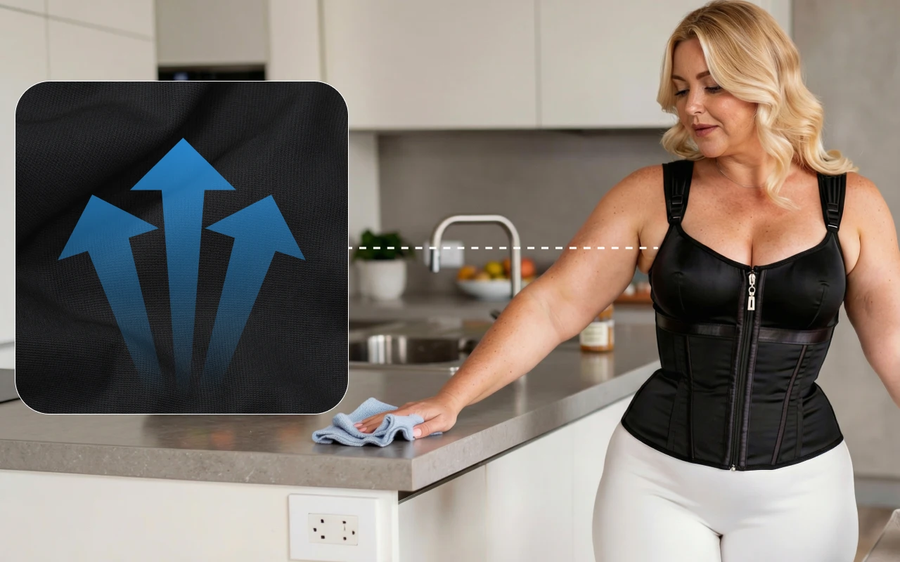 تتناسب الملابس بشكل أفضل وتظهر المنحنيات ناعمة. يبدو محيط الخصر أصغر بينما يستقيم القوام.