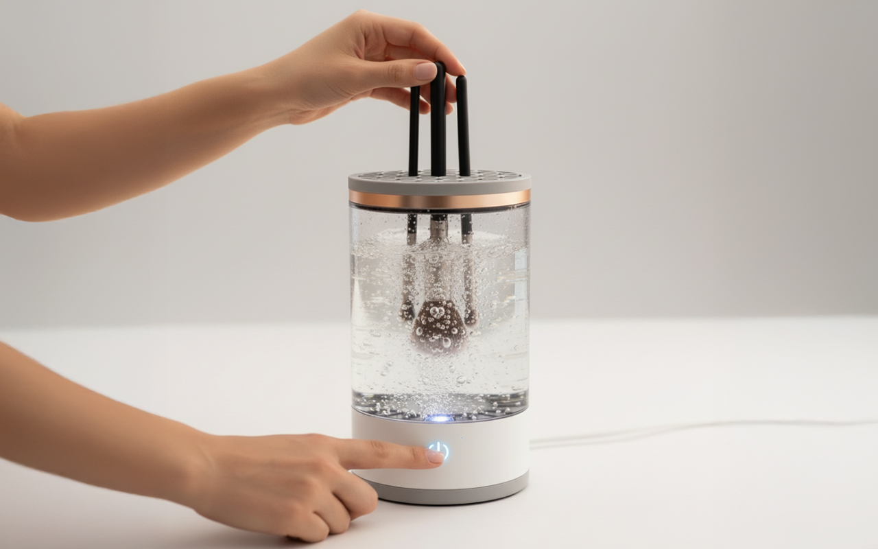 لا داعي لإضاعة الوقت أو الجهد في غسل الفرشاة بعد الآن. فقط اضغطي زرًا واحدًا وشاهدي كل فرشاة تعود نظيفة بسرعة.