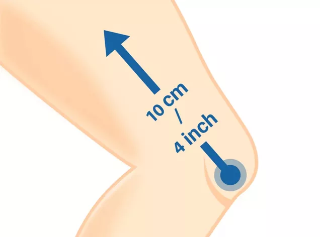 - 2. لف شريط القياس حول أوسع جزء من فخذك على بعد حوالي 10سم/4" من منتصف الرضفة.