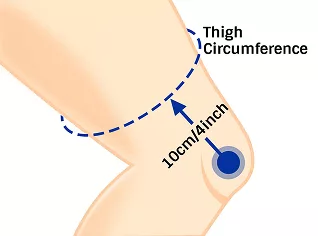 - 2. لف شريط القياس حول أوسع جزء من فخذك على بُعد حوالي 10 سم / 4 إنش أعلى منتصف الركبة.