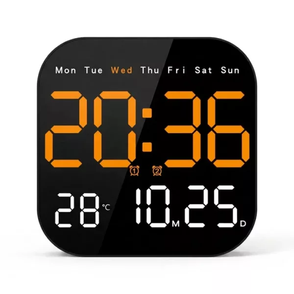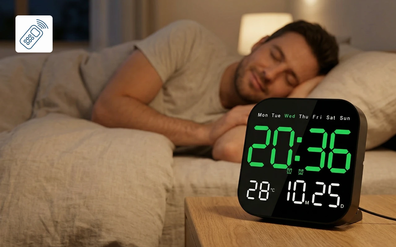 ساعة الحائط من Ortorex تحافظ على روتينك منظمًا في كل غرفة. شاشة واحدة تعرض يوم الأسبوع والتقويم ودرجة حرارة الغرفة. غيّر الإعدادات من السرير باستخدام جهاز التحكم عن بُعد. عشر درجات سطوع تناسب القيلولة والأفلام والصباح.