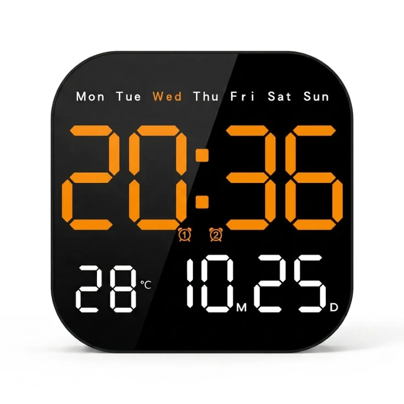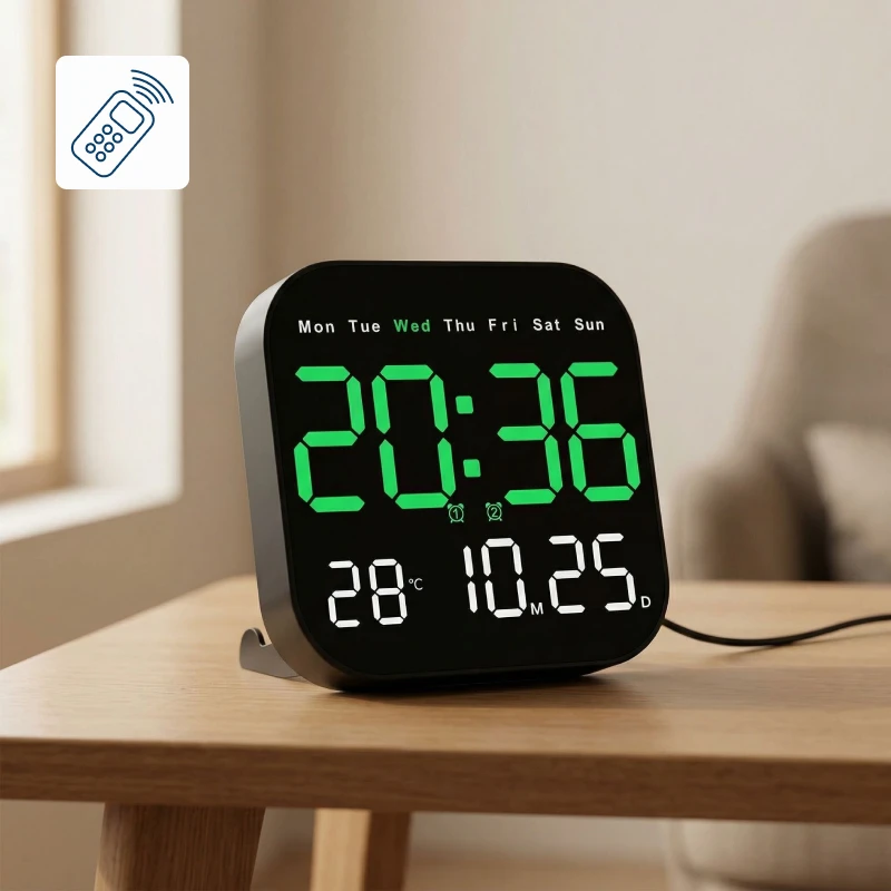 ساعة الحائط من Ortorex تحافظ على روتينك منظمًا في كل غرفة. شاشة واحدة تعرض يوم الأسبوع والتقويم ودرجة حرارة الغرفة. غيّر الإعدادات من السرير باستخدام جهاز التحكم عن بُعد. عشر درجات سطوع تناسب القيلولة والأفلام والصباح.