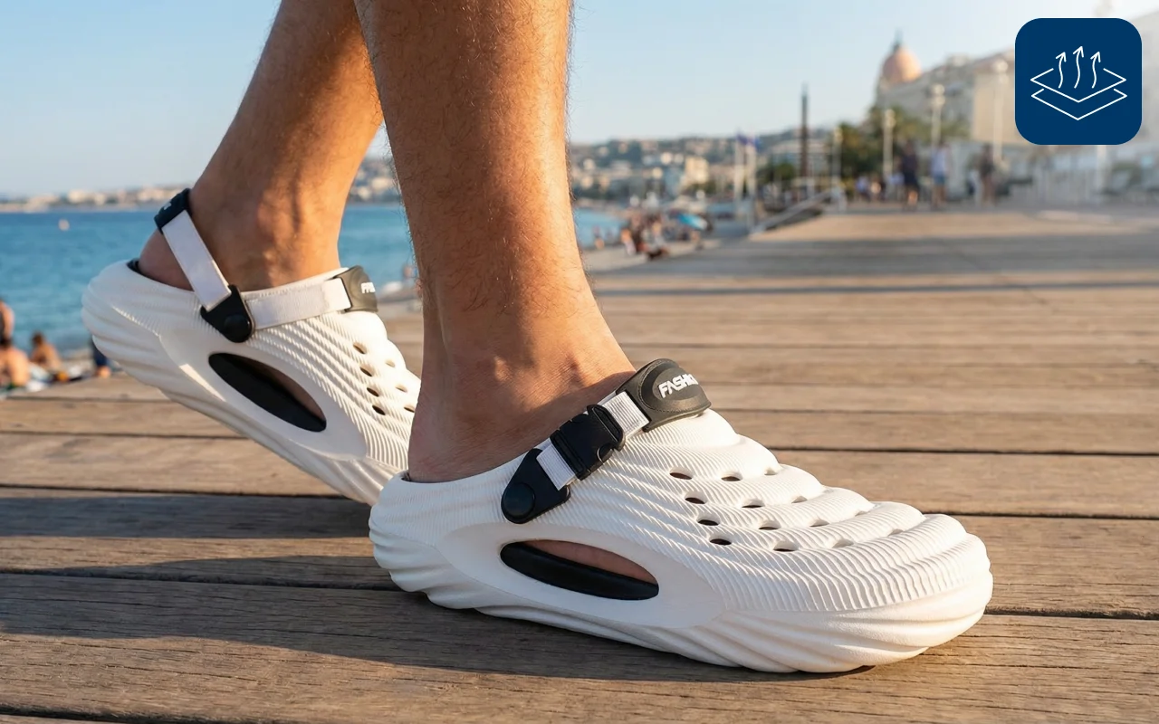 تسمح فتحات التهوية بتصريف المياه بسرعة بعد زيارات الشاطئ. تبقى قدماك جافتين ومنتعشتين حتى بعد البلل في الخارج.
