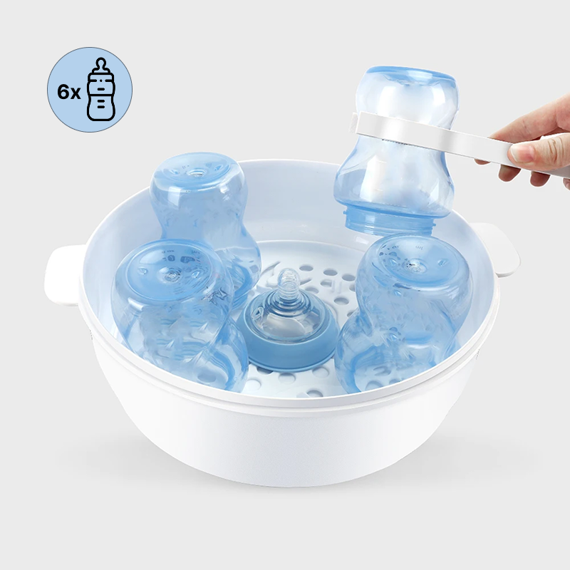 ست زجاجات تتسع معًا لعملية تعقيم واحدة بالبخار. مثالي للأيام المزدحمة أو للعائلات التي لديها أكثر من طفل.