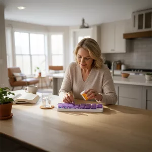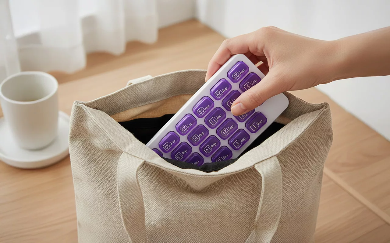 استخدام هذا المنظم يعني أنني لا أفوّت حبة الصباح أبداً. الأغطية الشفافة تساعدني في التأكد دون تفريغ كل شيء.