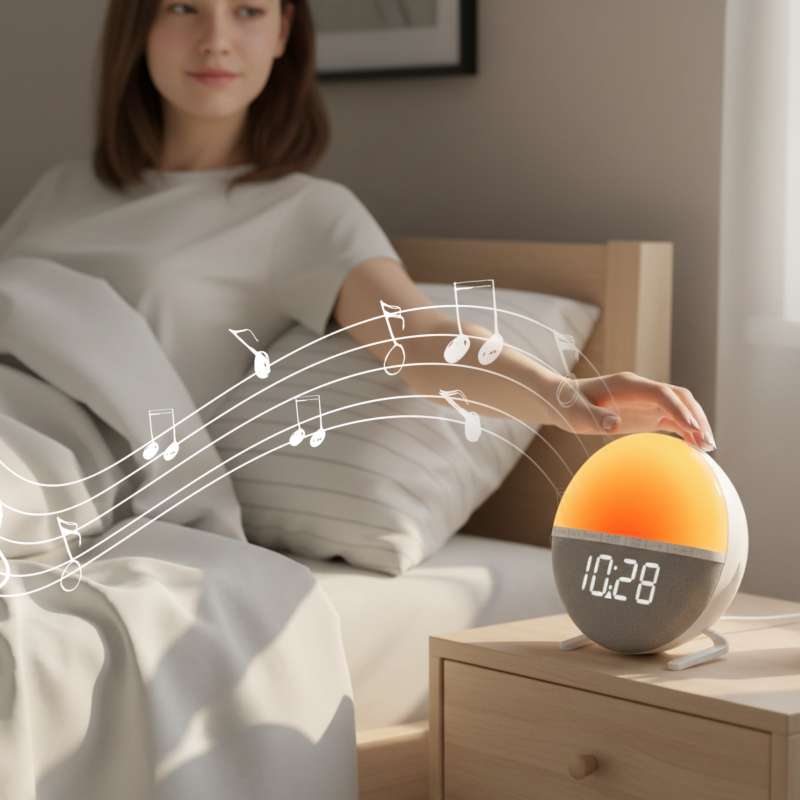 اختر من بين سبعة أصوات مريحة أو فقط ضوء الشروق. عشرة مستويات للصوت تضمن أن يجد الجميع روتينهم الصباحي المثالي.