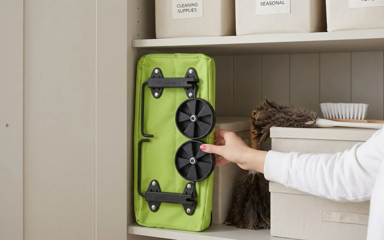تُطوى العربة إلى حزمة رفيعة تناسب الخزائن الضيقة. الهيكل خفيف الوزن يتدلى بشكل مرتب خلف الأبواب، مما يحرر مساحة ثمينة في الممر.
