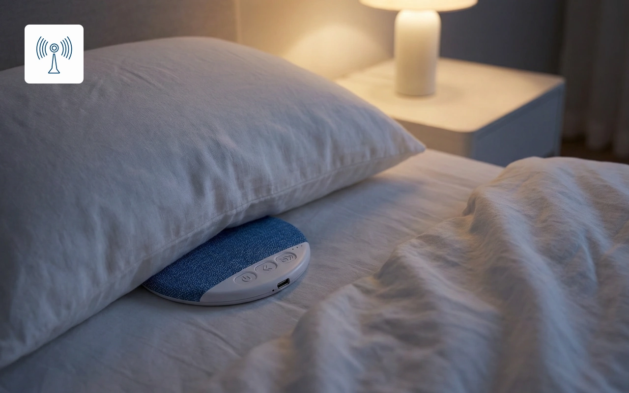 اتصل فوراً لتشغيل الموسيقى المفضلة أو البودكاست أو القصص. بدّل بين الضوضاء البيضاء المهدئة والصوت الشخصي في أي وقت.