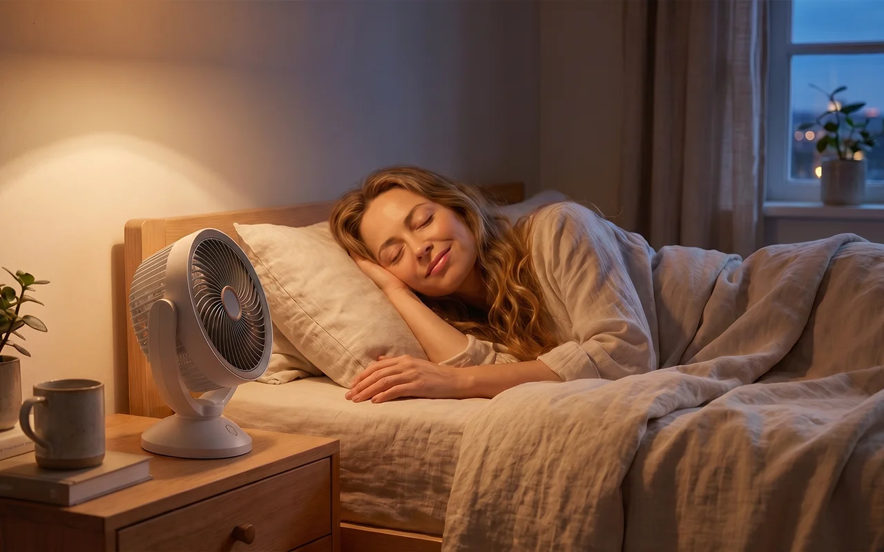 الصوت المنخفض يدعم نوماً أعمق خلال الأمسيات الدافئة. تدفق الهواء اللطيف يقلل من الشعور بالاختناق، مما يساعد على استرخاء الذهن بشكل أسرع.
