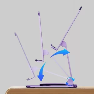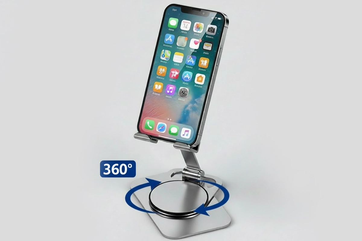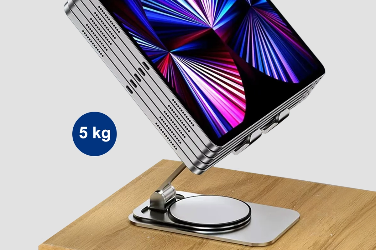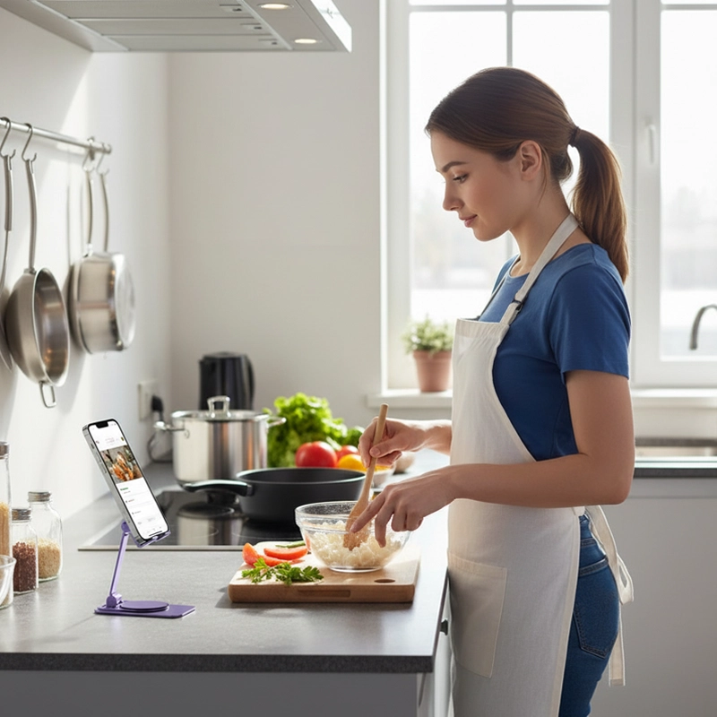 أحتفظ بهذا الحامل على سطح المطبخ للوصفات ومكالمات الفيديو أثناء الطهي. يميل بسلاسة ويسهّل عليّ ترتيب كامل مساحة العمل.