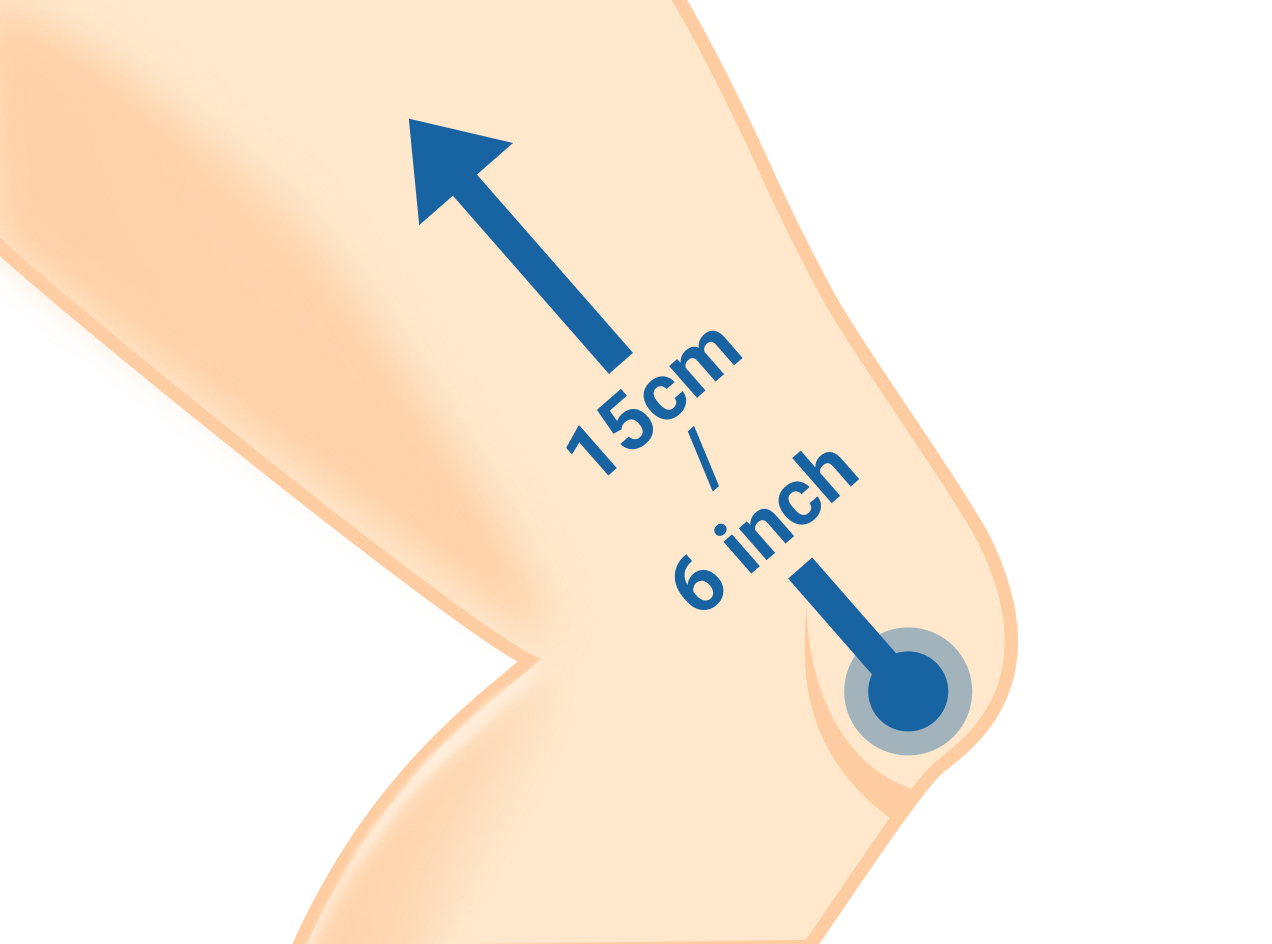 - 2. ابدأ شريط القياس على بُعد 15 سم / 6 بوصات فوق منتصف الرضفة وامده نزولًا حتى الكاحل.