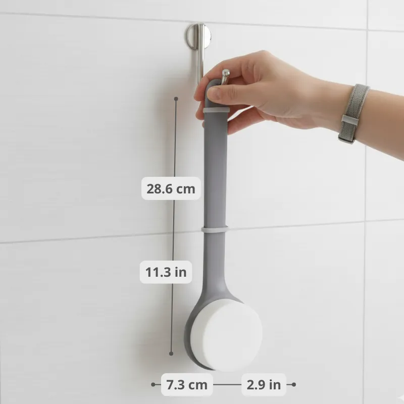 المقبض متين ومريح عند الإمساك به. أعلقها على الخطاف بعد كل استخدام. لم أمتلك فرشاة عملت بهذه الجودة على كتفي وأسفل ظهري.
