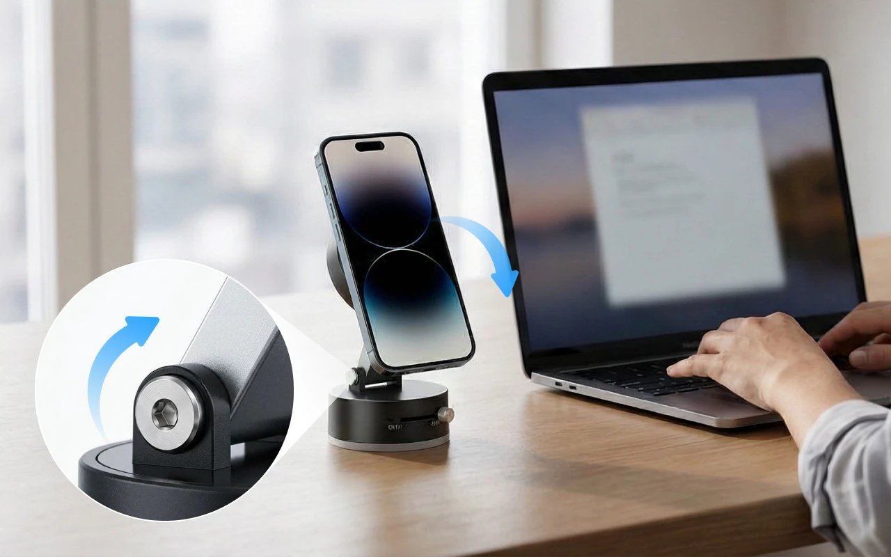 هذا الحامل أصبح رفيق سفري الآن. فقط ألصقه على مكتب الفندق لاتصال الفيديو مع العائلة. يطوى بسرعة ولا يأخذ أي مساحة تقريبًا.