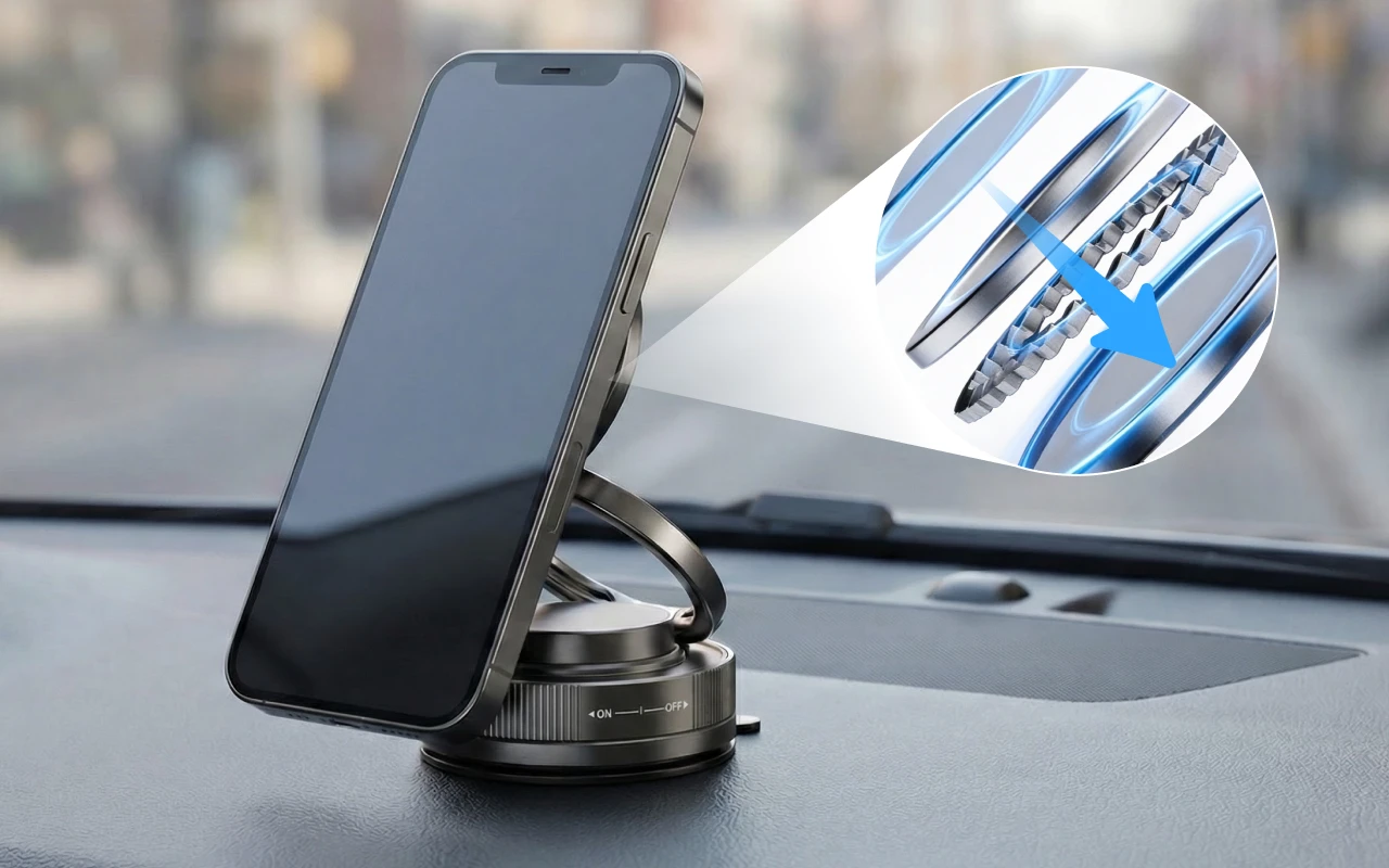 ستة عشر مغناطيسًا قويًا يبقي جهازك ثابتًا في جميع الأوقات. يظل هاتفك الذكي آمنًا، حتى عندما تهتز الطريق أو تنعطف بقوة.