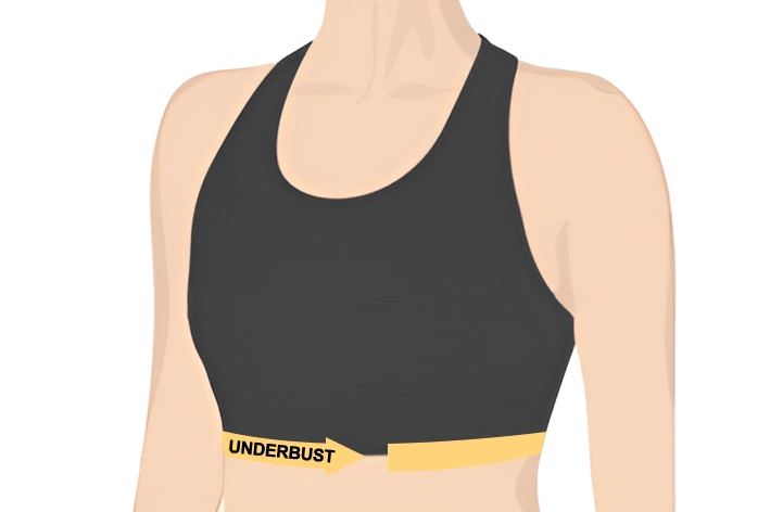 - 2. لقياس محيط تحت الصدر، لفي شريط القياس حول القفص الصدري مباشرة وتحت الصدر بشكل متساوٍ.