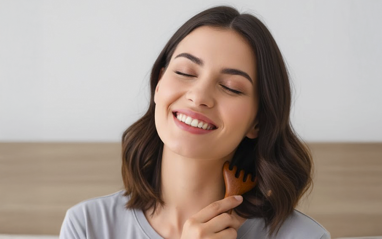 أسنان مستديرة وناعمة تدلك الجلد وتخفف التوتر. اشعر بالانتعاش مع كل تمريرة بينما يذوب التوتر.