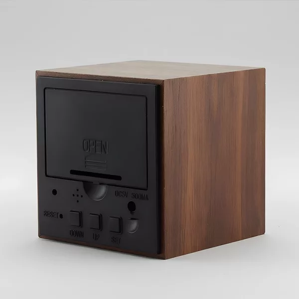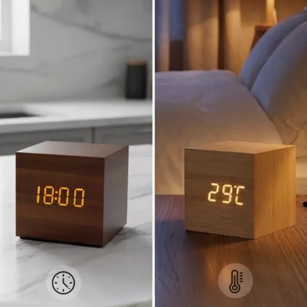 الاستيقاظ أصبح أقل إزعاجاً عندما أستخدم هذه الساعة. شكل الخشب يناسب كل شيء، والتحقق من درجة الحرارة مفيد قبل الذهاب للمدرسة.